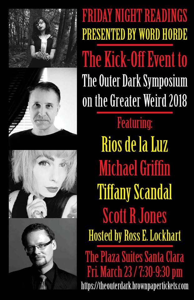 Thanks to Word Horde for sponsoring our Kick-Off event to The Outer Dark Symposium on the Greater Weird 2018 featuring readings by Mike Griffin, Rios de la Luz, Tiffany Scandal & Scott R Jones! Hosted by Ross E. Lockhart. Please tell your friends in the Bay Area because it’s open to the public for a $10 cover charge. Or we still have a few tickets left to the symposium, and it’s included in your membership. Spread the Weird! https://theouterdark.brownpapertickets.com