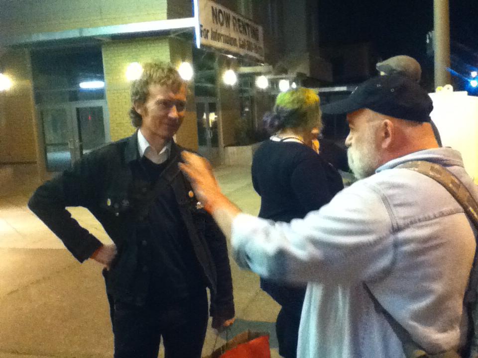 Waiting for the theater to open, I had a chance to meet the eminent Lovecraft scholar and editor S.T. Joshi, here in his Lovecraft eZine t-shirt beside Mike Davis.